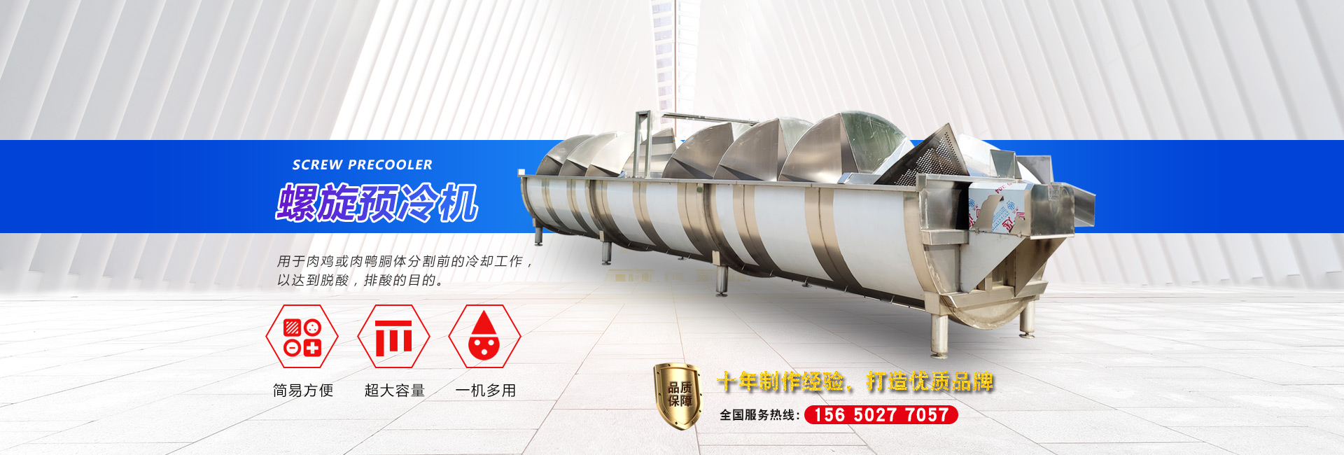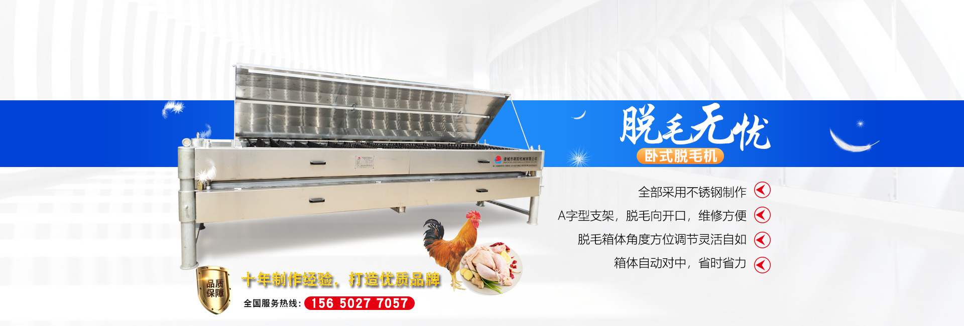 公司長期與國內(nèi)外屠宰加工企業(yè)合作,走引進(jìn)——消化——創(chuàng)新和自主研發(fā)相結(jié)合的道路,在國內(nèi)外同類產(chǎn)品的基礎(chǔ)上,不斷更新和改造。公司主要設(shè)備有:A字型立式脫毛機(jī)、臥式脫毛機(jī)、強力噴淋機(jī)、松毛機(jī)、浸燙池、螺旋預(yù)冷機(jī)、禽籠清洗機(jī)、電暈機(jī)、兔扯皮機(jī)、兔割前爪/后爪機(jī)、剝胗機(jī)、自動洗鉤機(jī)、螺旋燙爪機(jī)、雞爪脫皮機(jī)、分割輸送帶等屠宰用設(shè)備。其中,公司獨力發(fā)明生產(chǎn)設(shè)計的“電動調(diào)節(jié)脫毛機(jī)”及“自動控水控溫浸燙池”順利通過知識產(chǎn)權(quán)局的實質(zhì)性審查。公司所生產(chǎn)的設(shè)備 可與國外同類產(chǎn)品配套使用,設(shè)備遠(yuǎn)銷阿爾及利亞、澳大利亞等中東、非州等并建立了長期穩(wěn)定的合作關(guān)系。
